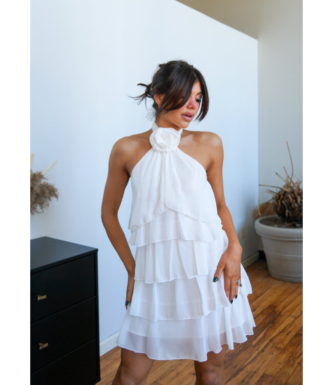 The Amora Mini Dress features a halter neckline with a large fabric rose that can be removed at the front. It has a fitted bodice that flows into a tiered, ruffled skirt with multiple layers of sheer fabric, adding volume and a whimsical touch.