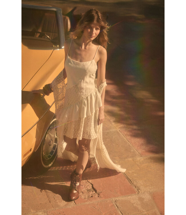 Barefoot in Bloom Mini Dress features a paneled design with floral lace and textured floral jacquard fabrics, scoop neckline, sleeveless with adjustable cami straps, asymmetrical drop-waist ruffle skirt and low back with an invisible zipper side closure.