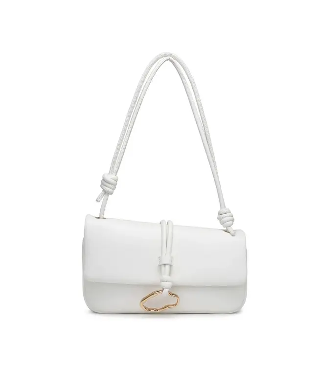 Belina Crossbody Bag — a sleek baguette handbag silhouette with knotted shoulder strap and sculptural hardware.