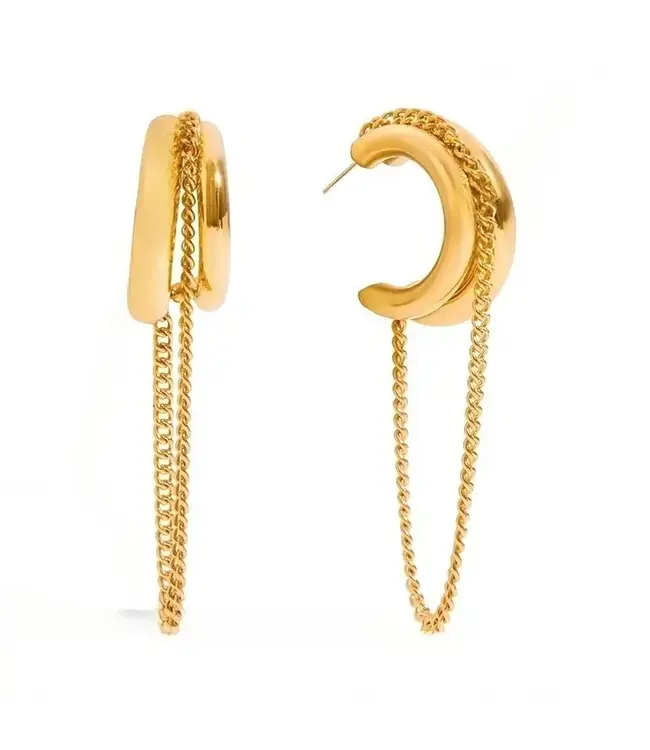 Make a bold statement with the Blaine Chain Hoop, featuring two sleek hoops connected by a delicate chain, these earrings add an edgy twist to your look. Perfect for those who dare to stand out, they fuse modern design with a touch of rebellious flair.
