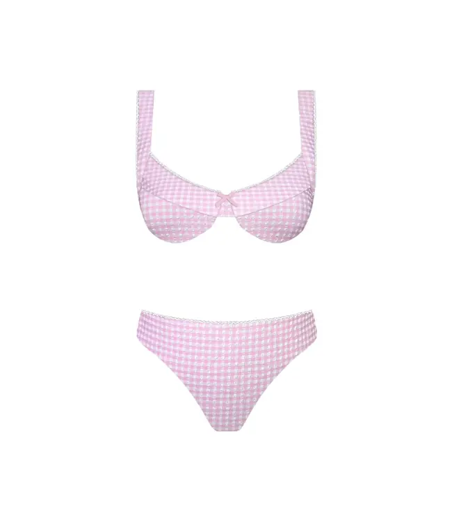 The Bubbly Bikini Bottom features a blush pink gingham print, lace trim and bow with bra underwire for the best support and moderate cheeky coverage. Read more.