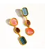 The Delia Drop Earrings feature a 18K gold plating, 18K gold vintage mismatch drop style, watermelon tourmaline handcrafted glass and brass shell.