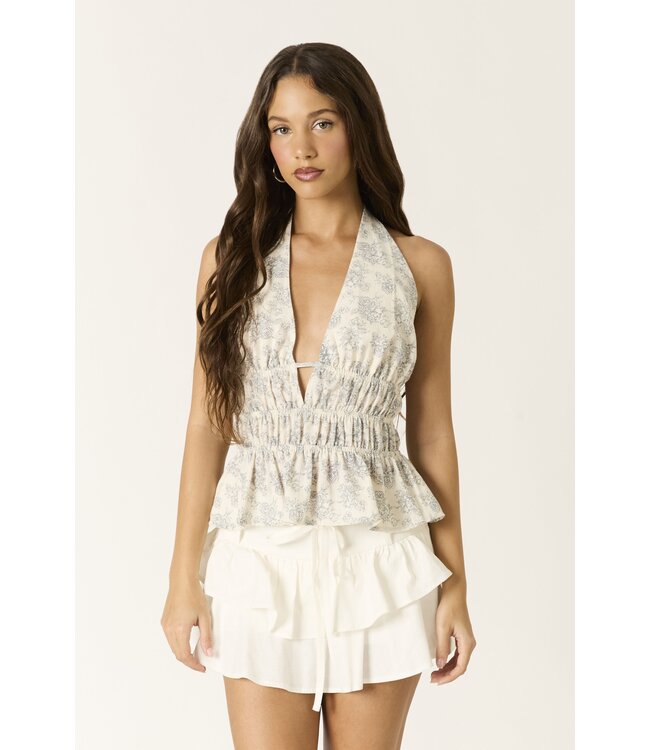 Our Delicate Energy Halter Top is the perfect dainty top for a spring summer look, it features a navy floral print patter, v-neckline with a ruffle hemline, adjustable halter neck tie and open back.