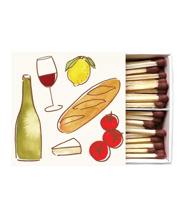 Beautiful Hand-painted Original Watercolor wine, baguette, tomatoes, cheese, lemon, 70 Match sticks with dark brown tips