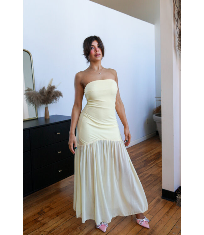 Our Dolce Maxi Dress features a strapless tube top style, fitted bodice and sheer flowy hemline.