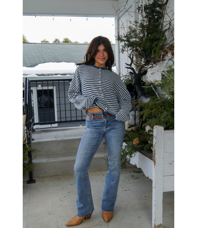 Classic denim is hard to say no to, the Emilia Jean features a medium to light denim wash, clean stretch, mid-rise waistband with a zipper and front button closure and a bootcut style with a raw hemline. Read more.
