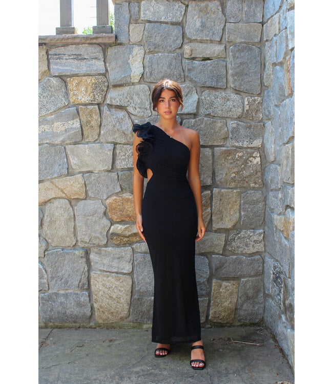 Our favorite show stopping formal gown! Featuring one shoulder maxi dress, Ruffle twist detail, with a side cutout. Model is wearing a size small.
