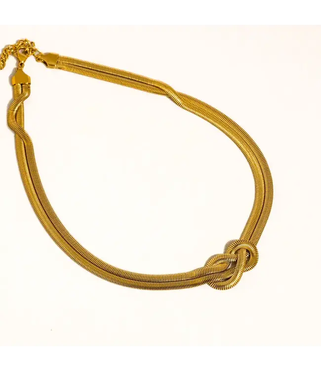 Evereign Knot Necklace is an 18K Gold Non-Tarnish knot necklace with a clasp closure.