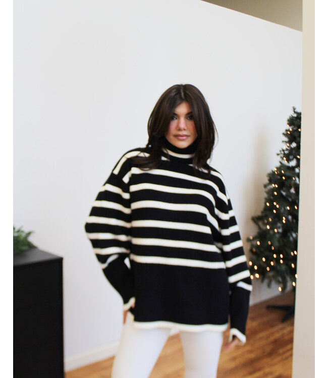 We love a striped statement piece for your wardrobe! The Fine Lines Sweater features an oversized turtleneck, long sleeve bell sleeve, flattering side slit and panel pinstripes.