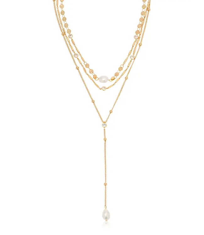 The Forever Falling Necklace features a 18k Gold Plated, Brass, Cubic Zirconia and Freshwater Pearls