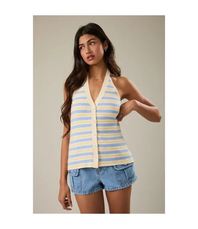 The Gisele Halter Top is bringing all the spring color, it features a ribbed knit sweater material, baby blue stripe pattern halter v-neckline and front button closure.