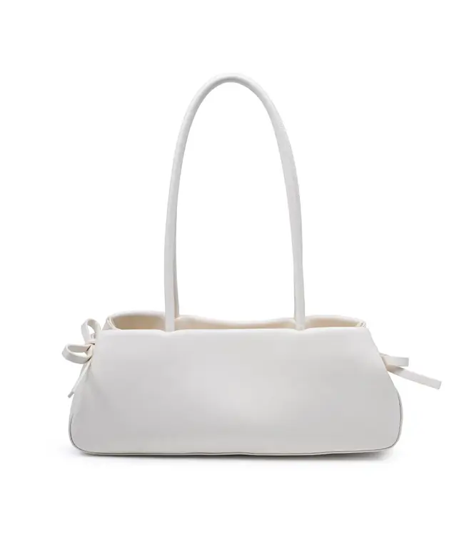 Soft-curve baguette — Halo Shoulder Bag. Sculpted, slender silhouette with long shoulder straps, side knot accents, and a clean profile. Vegan-friendly materials, durable build, lightweight carriage.