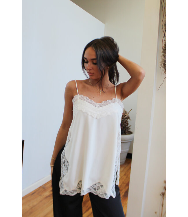This top is pulling at our Heartstrings, this top feature a cami style with delicate lace trim with a sassy high side slits for a chic and romantic look.