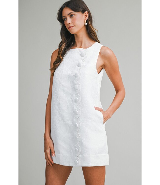 Our Jackie O Mini Dress is designed with a clean, sleeveless silhouette, it features subtle textured fabric and a charming jacquard scallop trim accented by covered buttons down the front and side pockets detailing.