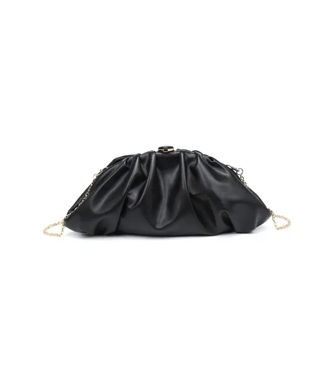 Cloud-soft ruched silhouette — Jennifer Clutch. A sleek vegan leather clutch with a sculptural ruched body, secure top clasp and removable chain strap. Compact yet roomy enough for phone, cards, keys; ideal as an evening clutch or convertible crossbody.