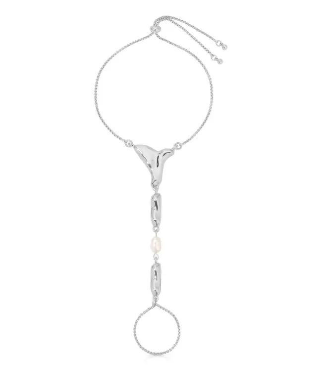 The Liquid Metal Hand Chain features a melting liquid look with 18k silver plating, Zinc, and a statement freshwater pearl.