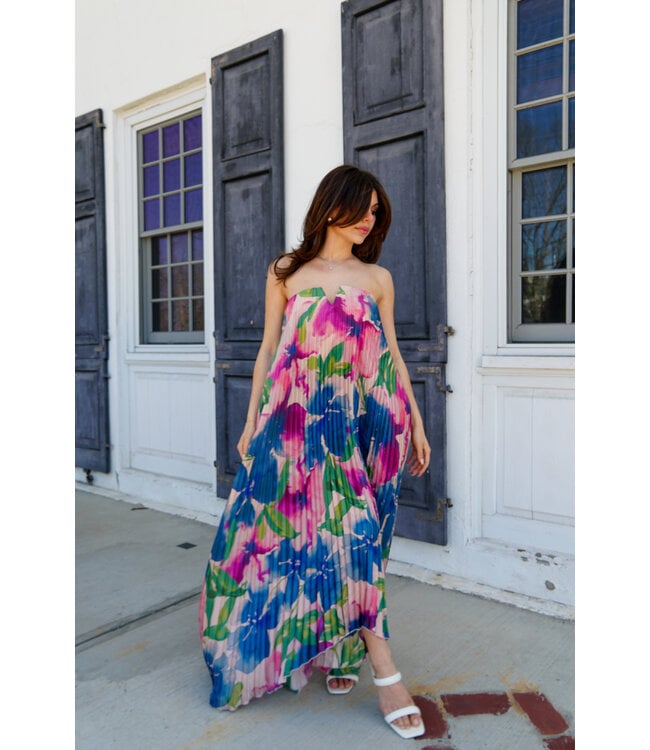 The Match Made Maxi Dress features a pleated chiffon fabric, V cut out tube top style, soft boning on bodice, asymmetrical hem with a center back invisible zipper. Read more.