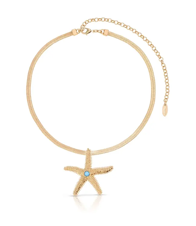 The Mermaid Cove Necklace features a 18k Gold Plated, Brass chain, Zinc Starfish Pendant, Reconstructed Turquoise