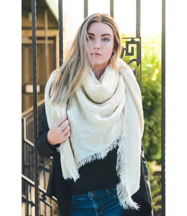 The Moon Frost Scarf features a trendy open weave and frayed edges. Perfect for fall and winter, it's both fashionable and functional. The soft, warm texture makes it ideal for layering, adding a chic, boho touch to any outfit.