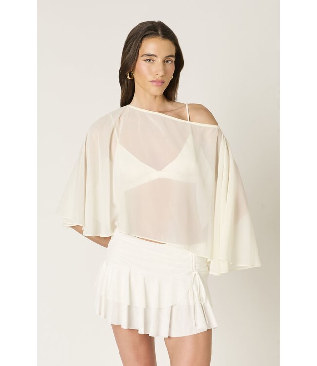 The Pia Poncho is a lightweight chiffon knit with a relaxed asymmetrical hem with an off-the-shoulder neckline and a semi-sheer finish. Read more.