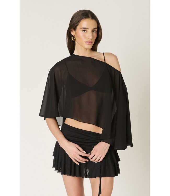 The Pia Poncho is a lightweight chiffon knit with a relaxed asymmetrical hem with an off-the-shoulder neckline and a semi-sheer finish. Read more.