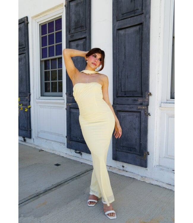 The Sunbeam Maxi Dress is a strapless maxi dress with high choker-style neck band that connects to the strapless bodice. It has a low, cowl-open back that drapes beautifully and fastens with two delicate ties at the upper and mid-back.