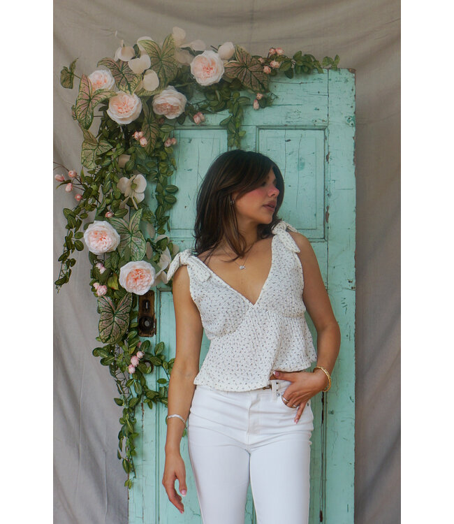 The Susanna Top is the cutesy top your closet needs, it features a tiny floral print pattern, deep v-neck and tie shoulder straps.