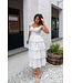 Our Sweet Talk Midi Dress features a tiered midi dress in white with delicate blue floral print, smocked bodice, square neckline with soft ruching and tie-front detail cap sleeves with elastic gathers for a romantic look and fully lined.