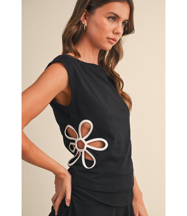 Chic Spring top alert, The Black Blossom Top features a round wide neckline, sleeveless with a daisy cut out design on both sides!